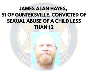 On September 3, 2024, Hayes entered the Geraldine Police Department where he informed officers that he needed to confess to a crime that occurred in Marshall County. Inv. Hagan Wilbanks and Inv. Robert Fann responded for the Guntersville Police Department and the Marshall County Sheriff’s Office, respectively. Hayes confessed to Inv. Wilbanks and Inv. Fann that he molested a family member while living in Guntersville when she was approximately 9 years old.